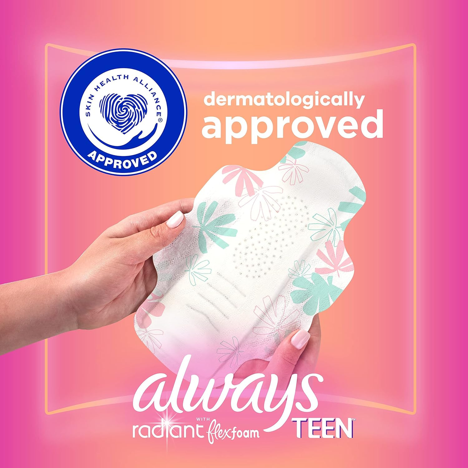 UP TO ZERO LEAKS, ZERO FEEL AND ZERO BUNCH protectionJUST ONE PAD can last up to ten hours…that's longer than an average school day!MADE WITH FLEXFOAM for a thin and flexible padSECURE WINGS STAY IN PLACE and conform to your body for up to zero bunchingDERMATOLOGICALLY TESTED by the Skin Health AllianceAlways products are FSA/HSA ELIGIBLE Always Radiant Teen with FlexFoam Period Pads (with wings) provide up to 100% leak-free protection. Always Radiant Teen with Flexfoam pads allow you to wear what you want, any day of the month. The FlexFoam technology allows these pads to be flexible, offering an up to zero feel experience. Just one pad can last up to 10 hours, longer than the average school day! Accompanied by a clean opening package allowing for quick and easy access, so you can grab a pad whenever needed. With Always Radiant Teen with FlexFoam pads, up to 100% leak and odor-free protection is possible! Always Radiant Teen with Flexfoam menstrual pads have been dermatologically tested, and approved by the Skin Health Alliance, an independent organization led by dermatologists and scientists. The qualification process includes an assessment of the ingredients, and clinical trial data. Always FlexFoam products have been endorsed by the SHA for several years and we will continue working with professionals to ensure our products meet high external standards. For those needing extra protection, try Always Radiant FlexFoam Overnight Absorbency period pads or Always Radiant FlexFoam Heavy Flow Overnight Absorbency period pads that offer up to 12 hours of zero leaks and zero feel, for overnight use. And for those who are on-the-go, try Always Pocket Flexfoam, powerful protection made portable.
