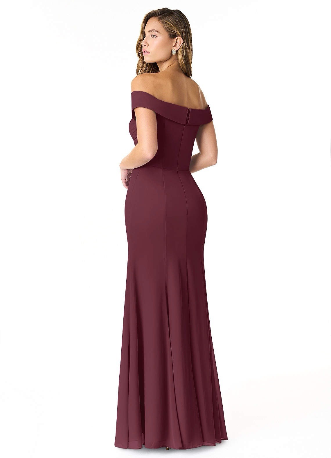 Azazie formal maxi dress in a deep burgundy/wine red. Features a ruched crossover (surplice) bodice with wide straps and a flowy A-line skirt. Fully lined with back zipper closure.Approx measurements (laid flat):• Pit to pit: 16”• Length: 55”Bordeaux • merlot • wine red • floor length • wedding • prom • evening gown • flowy • lined • zip back • cocktail formal