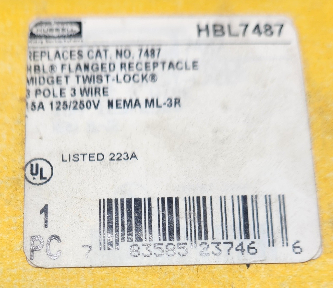 This listing is for a Hubbell HBL7487 twist-lock midget flanged outlet, rated 15A and 125/250VAC. Condition is New, suitable for business and industrial electrical applications where a secure twist-lock connection is required. Free Shipping is included, helping you plan costs up front and receive the item without additional delivery charges. The description provided does not include further specifications, included accessories, or packaging details, so check the listing for details. Please review photos and the full listing information to confirm compatibility with your existing equipment and installation requirements.